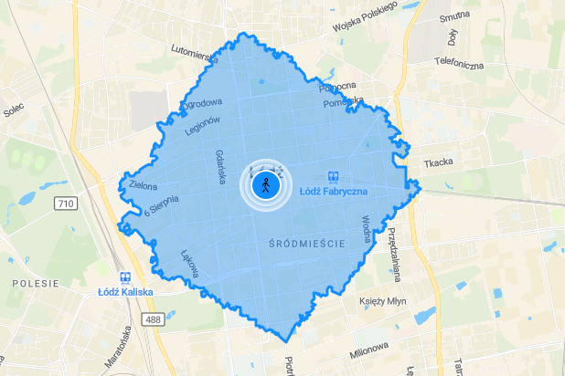 App to identify an area reachable by different means of transportation from a given place.