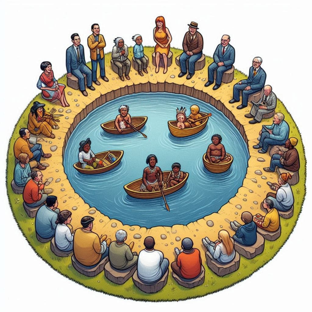 "На другом берегу пруда" - фразеологизм в испанском языке латиноамериканского происхождения, ссылающийся на Евразафрику, её жителей и отличия их культурных особенностей от оных жителей Америк